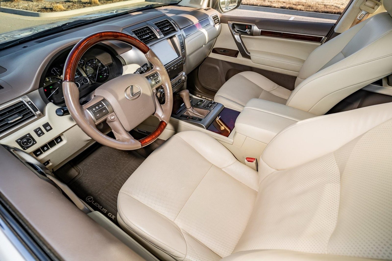 Starfire Pearl 2016 Lexus GX 460 Luxury 4WD 6-Speed Automatic with Sequential Shift ECT 4.6L V8 DOHC Dual VVT-i 32V – ADJUSTABLE SUSPENSION – AIR CONDITIONED SUNROOF VENTS – AIR CONDITIONING – AUTO DIMMING MIRRORS – AUX PORT – BLIND SPOT DETECTION – BLUETOOTH – CLEAR BRA – CRUISE CONTROL – DUAL ZONE CLIMATE CONTROL – HEATED AND COOLED SEATS – HEATED STEERING WHEEL – HEATER – HID HEADLIGHTS – LEATHER SEATS – LED DAYTIME RUNNING LIGHTS – MEMORY SEATS – NAVIGATION – ONE TOUCH DRIVER WINDOW – ONE TOUCH PASSENGER WINDOW – POWER FOLDING MIRRORS – POWER LOCKS – POWER MIRRORS – POWER SEATS – POWER STEERING – POWER TELESCOPING AND TILTING STEERING WHEEL – POWER WINDOWS – PUSH BUTTON START – REAR ENTERTAINMENT – DIMMING REAR VIEW MIRROR – REVERSE CAMERA – RUNNING BOARDS – SMART PROXIMITY KEY – SPORT MODE – SUNROOF – TRACTION CONTROL – TRIP COMPUTER – TWILIGHT SENSING HEADLIGHTS – UNIVERSAL GARAGE DOOR OPENER – USB CHARGING PORTS – POWER DISC BRAKES Adaptive suspension Auto tilt-away steering wheel Auto-leveling suspension Automatic temperature control Blind Spot Sensor Cargo Net Dual-Screen Rear Seat Entertainment System Emergency communication system Fully automatic headlights Garage door transmitter: HomeLink Headlight cleaning Heated & Ventilated Front Bucket Seats Heated door mirrors Heated rear seats Illuminated entry Illuminated running boards Rain sensing wipers Rear air conditioning Remote keyless entry.