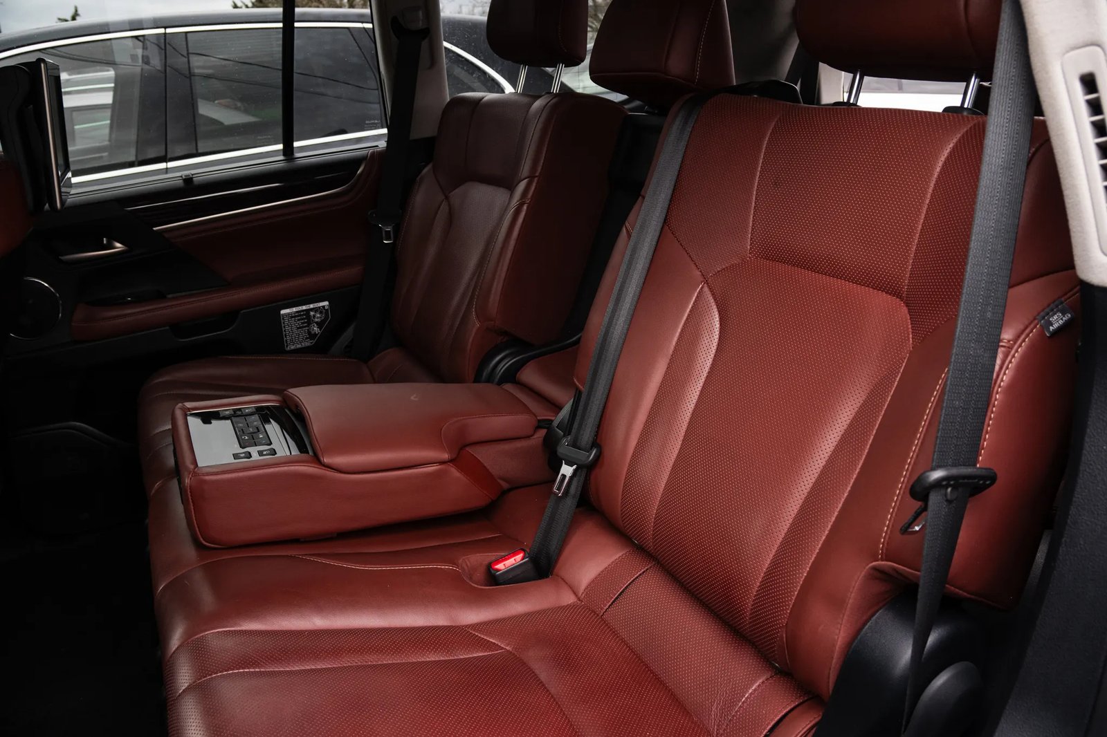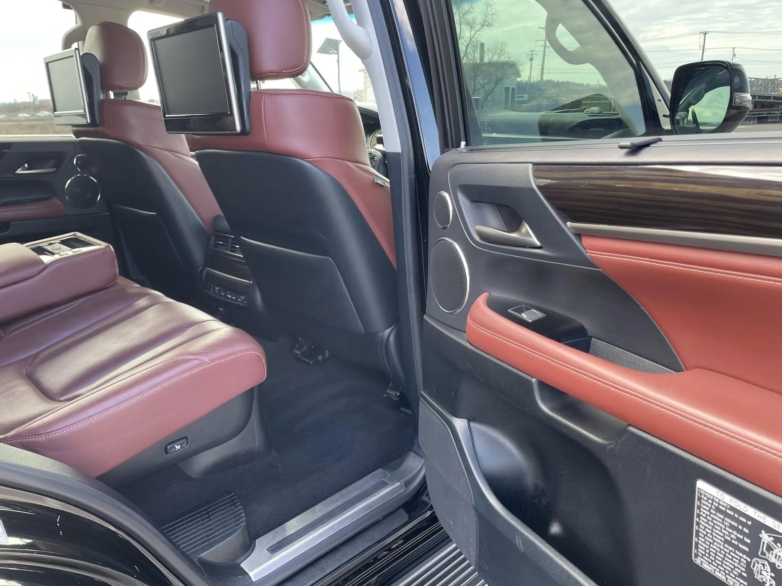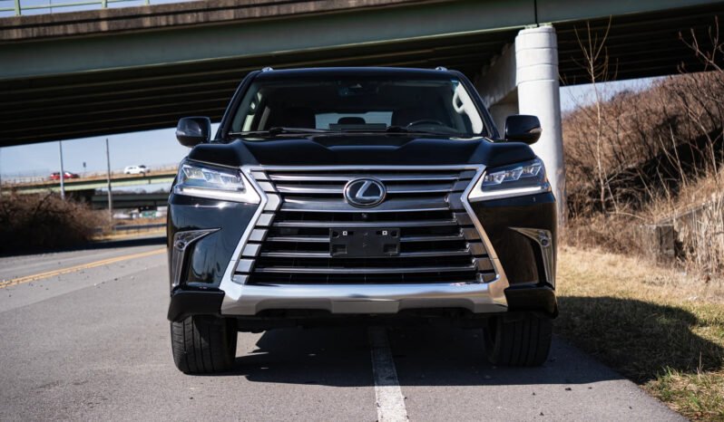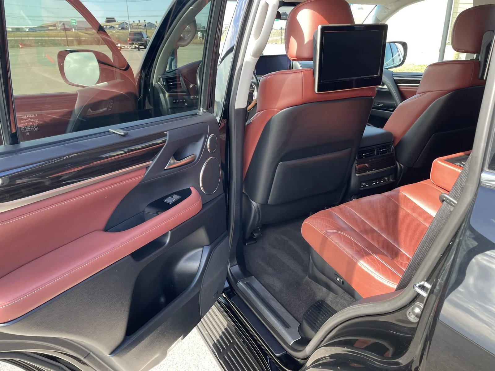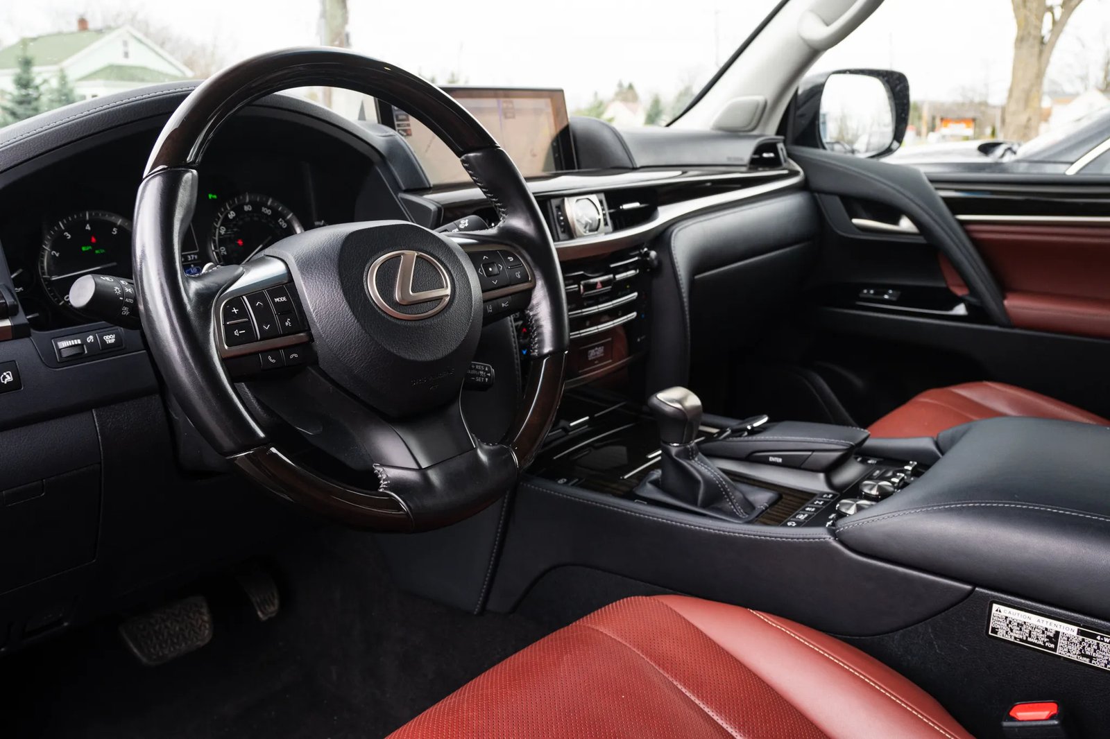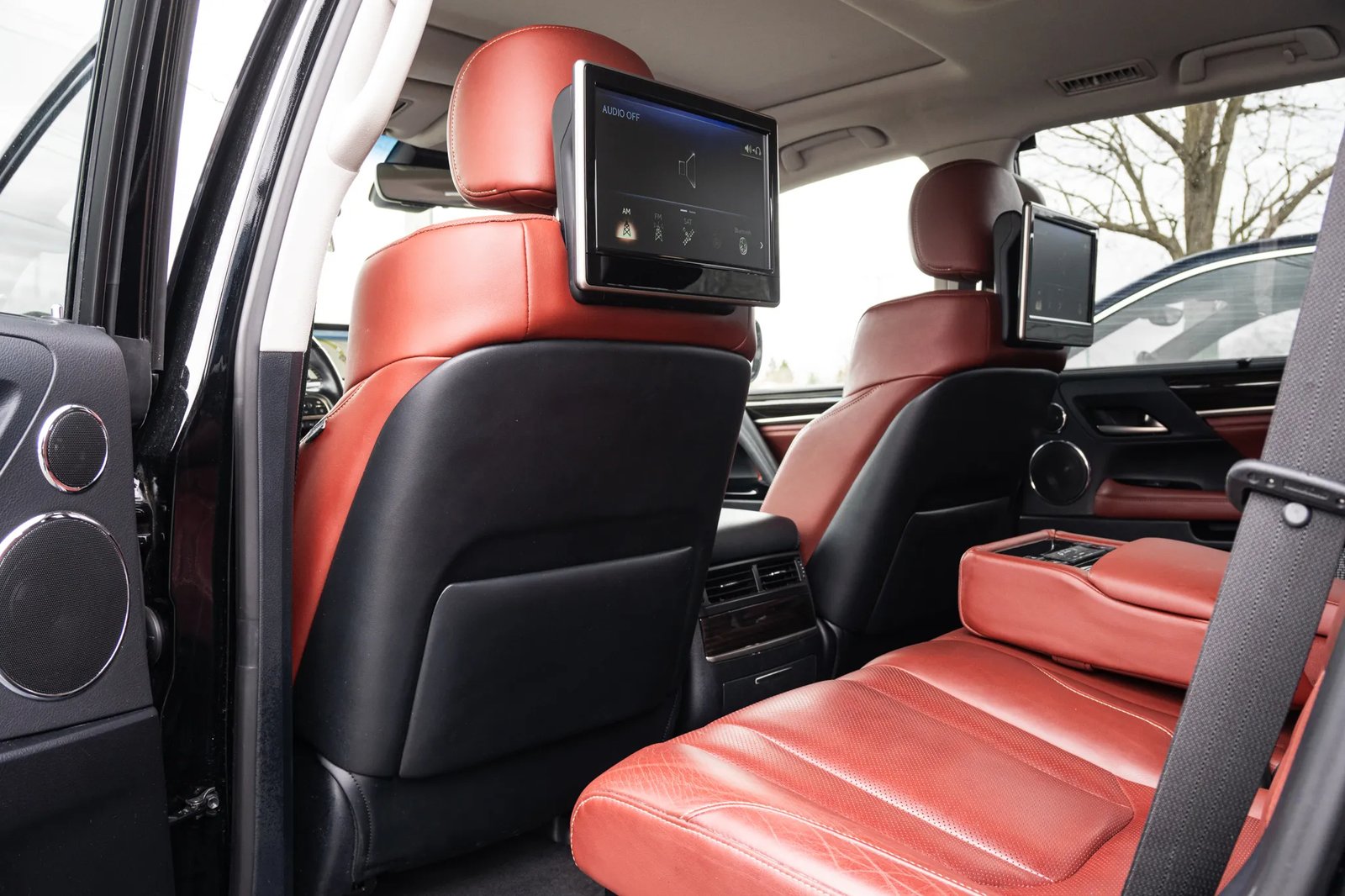 CLEAN CARFAX. BLACK 2018 LEXUS LX570 WITH RED SEMI-ANILINE LEATHER UPHOLSTERY, 5.7L V8, 8-SPEED AUTOMATIC TRANSMISSION, DUAL-RANGE TRANSFER CASE, AND LIMITED-SLIP CENTER DIFFERENTIAL. EQUIPPED WITH LUXURY PACKAGE, ADAPTIVE VARIABLE SUSPENSION, 21″ ALLOY WHEELS, POWER SUNROOF, TRIPLE-BEAM LED HEADLIGHTS, PANORAMIC VIEW & MULTI-TERRAIN MONITORS, HEATED & VENTILATED FRONT & REAR SEATS, FOUR-ZONE CLIMATE CONCIERGE, MARK LEVINSON 19-SPEAKER SURROUND SOUND, REAR SEAT ENTERTAINMENT SYSTEM, HEAD-UP DISPLAY, AND LEXUS SAFETY SYSTEM+