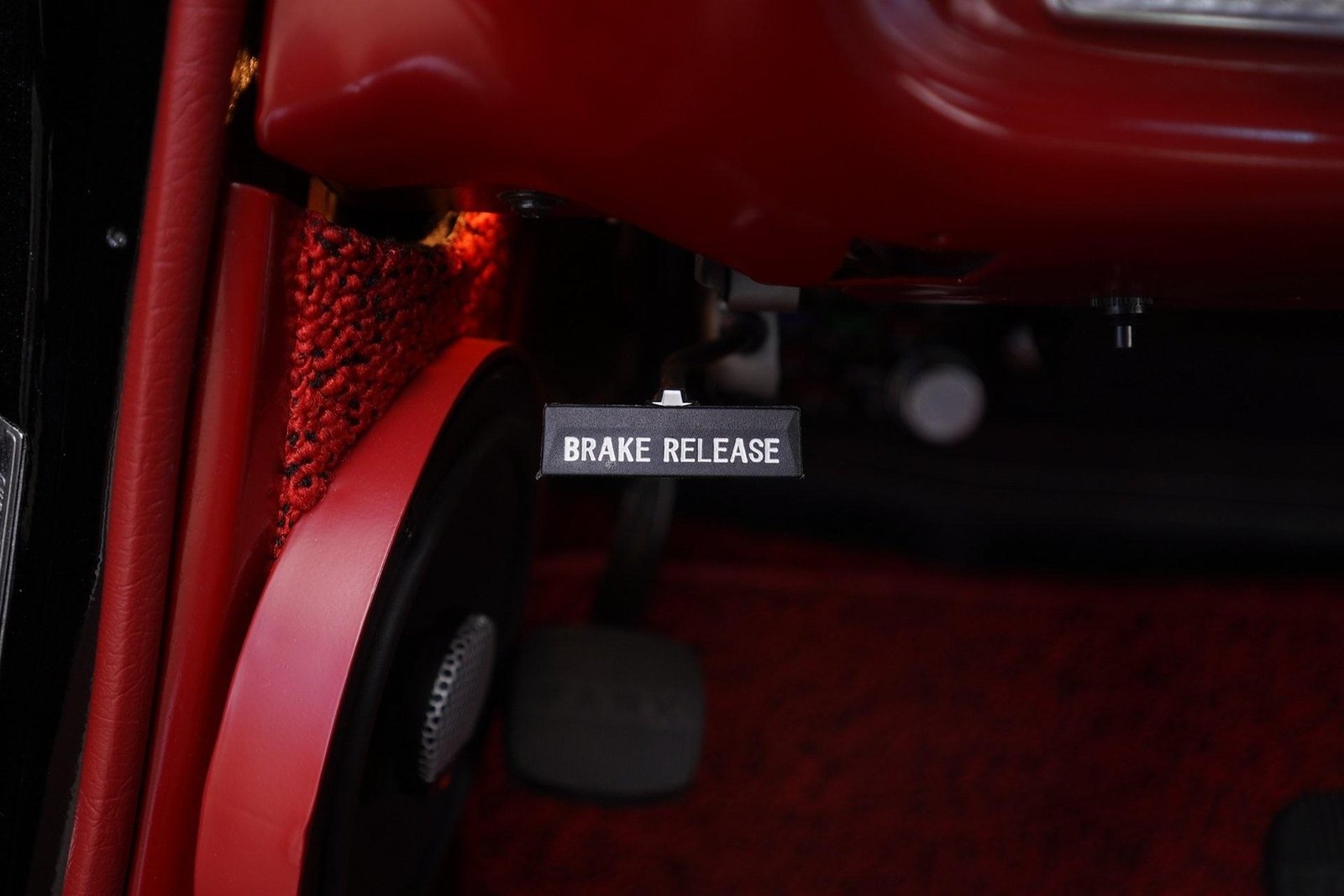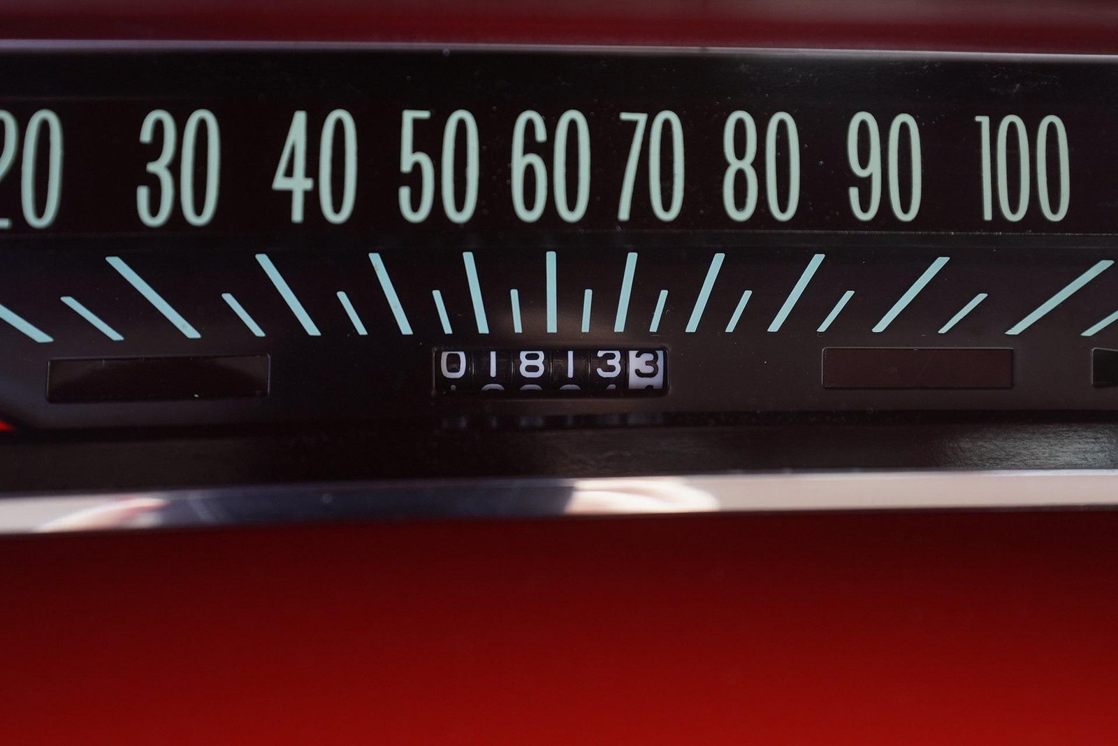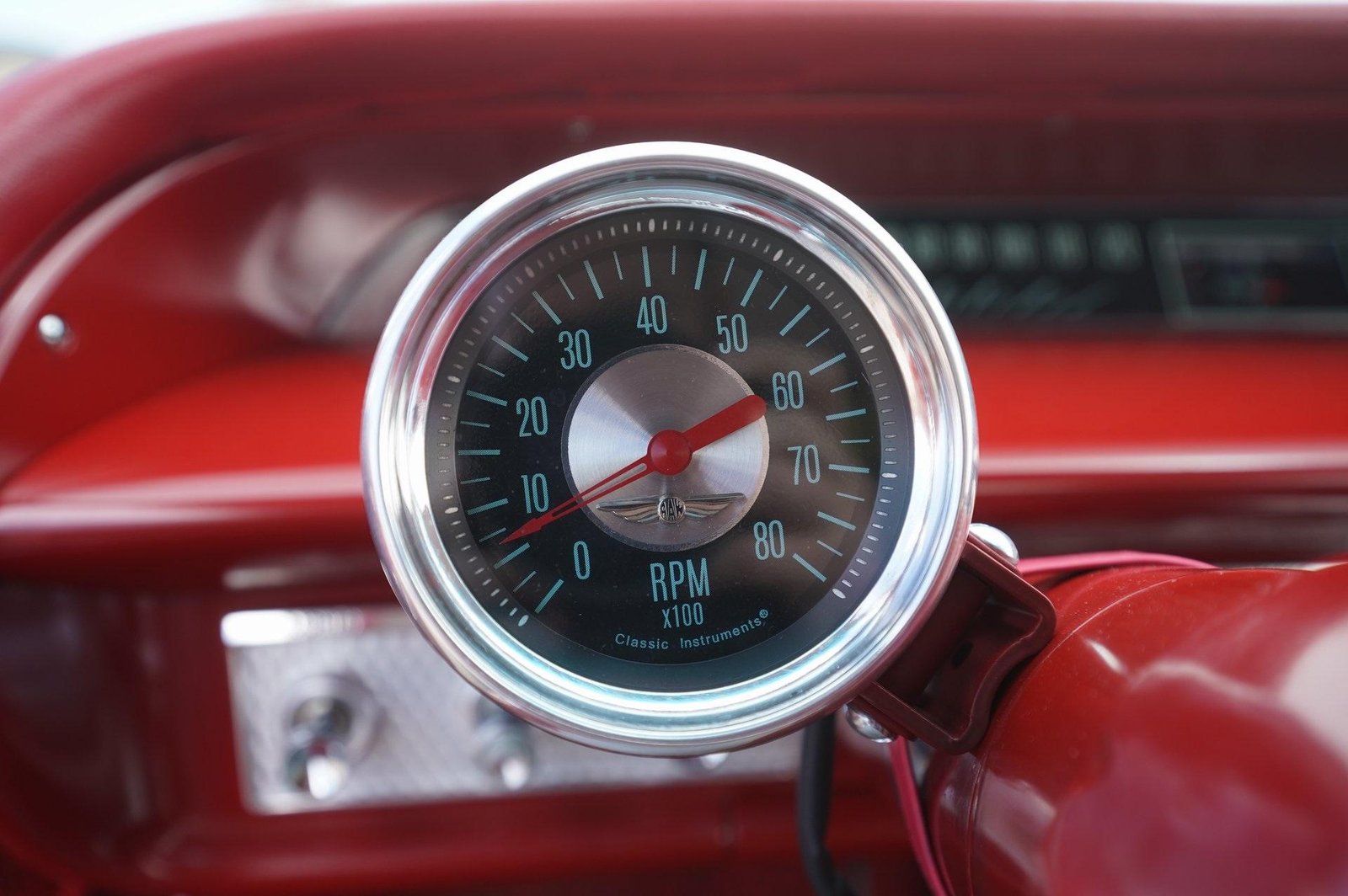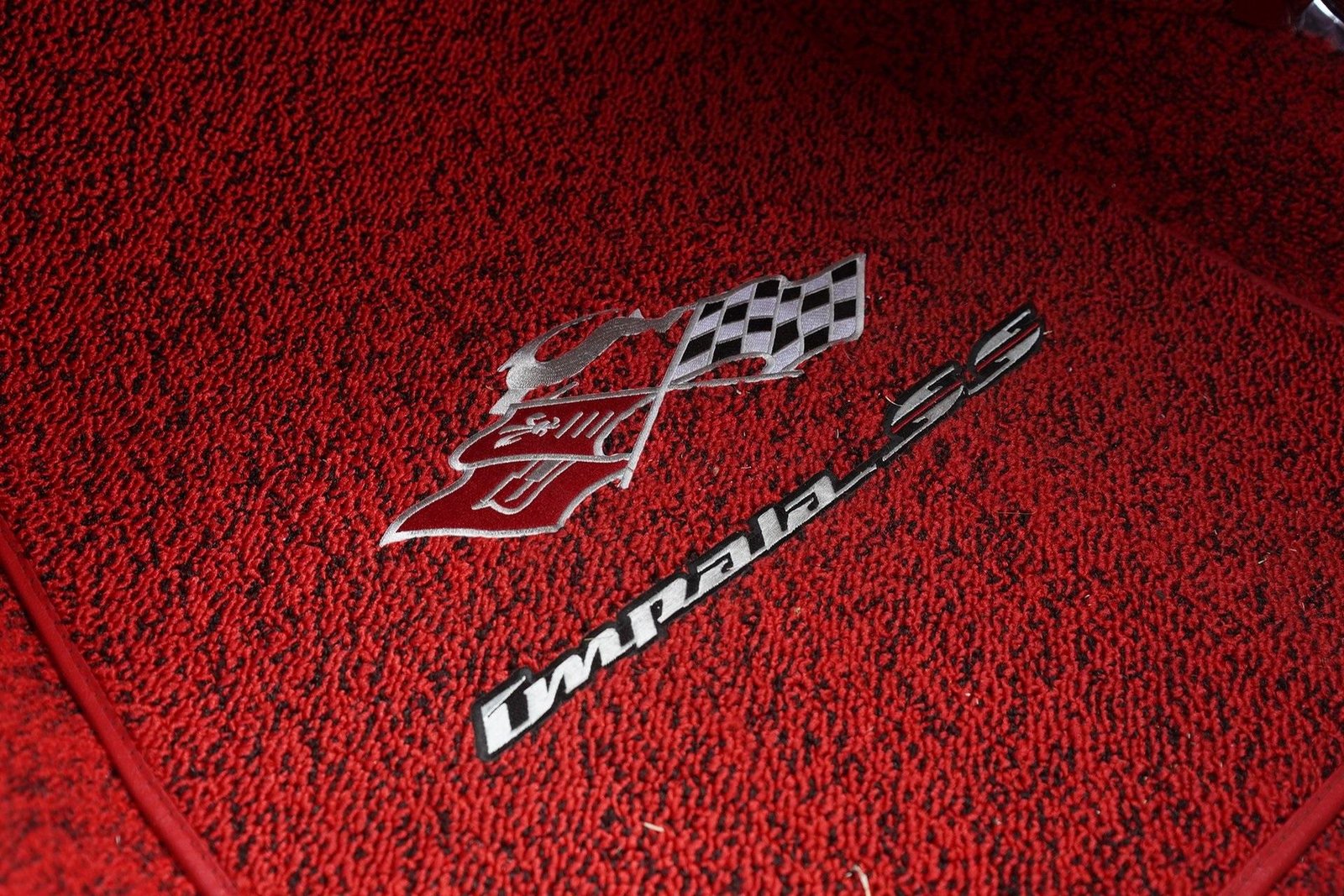 The red upholstery, bucket seats up front, and bench seating in the rear provide a comfortable and stylish ride. The particular black and red tuxedo carpeting, leather-wrapped steering wheel, new OER automatic shift console batt gauges, custom-made tachometer SS dash trim and knobs, center console, and aftermarket radio complete the impressive interior.