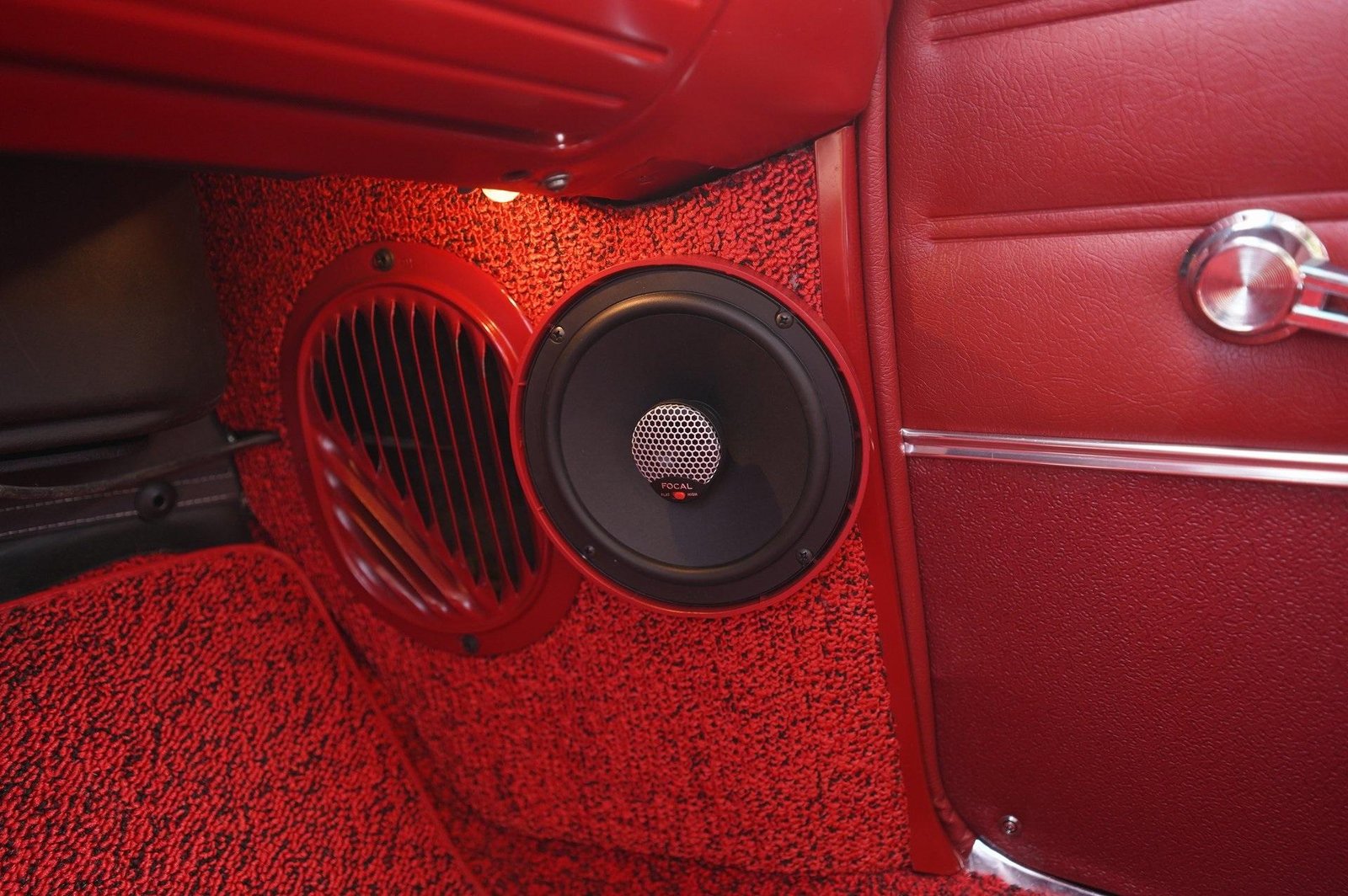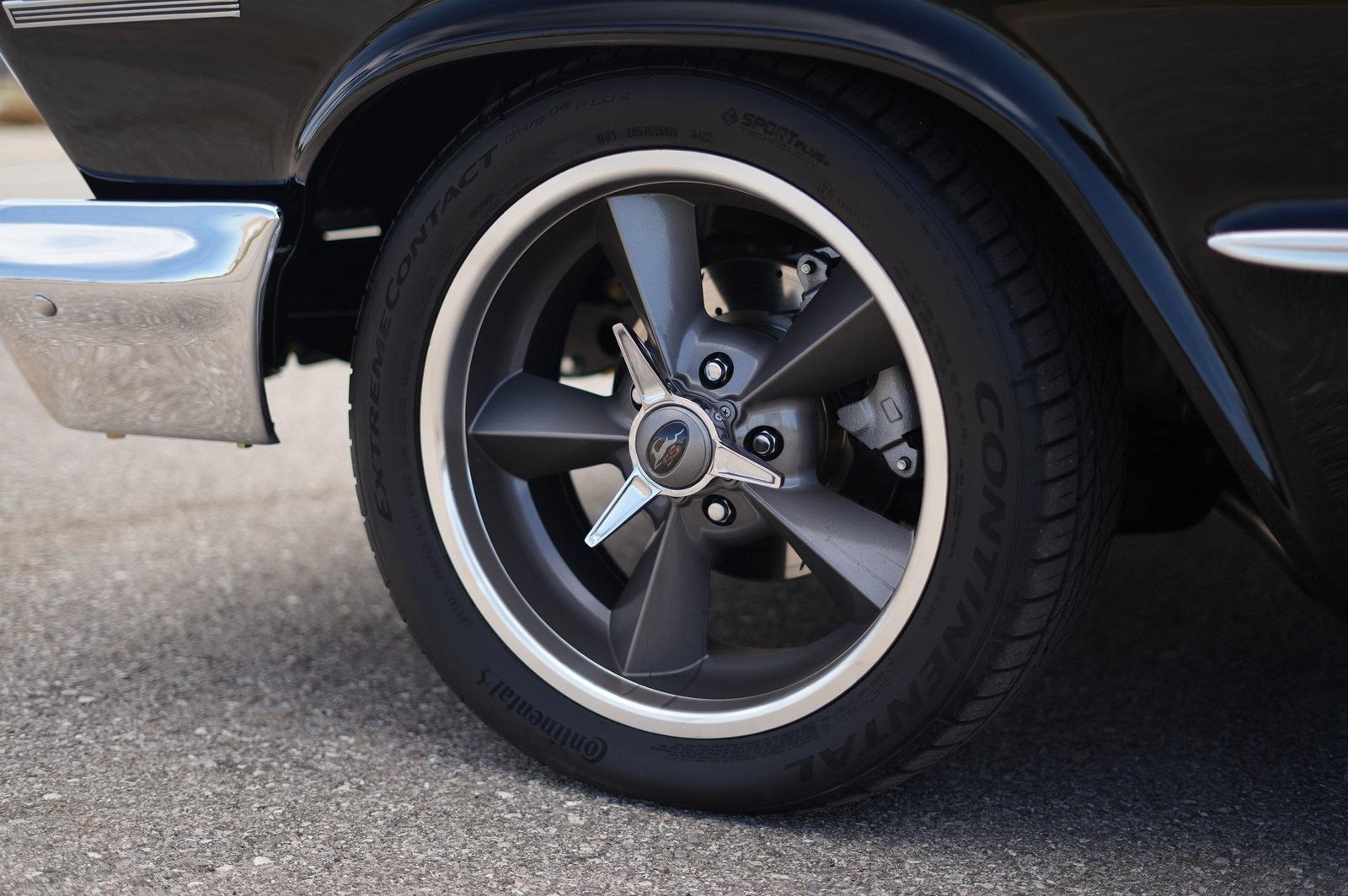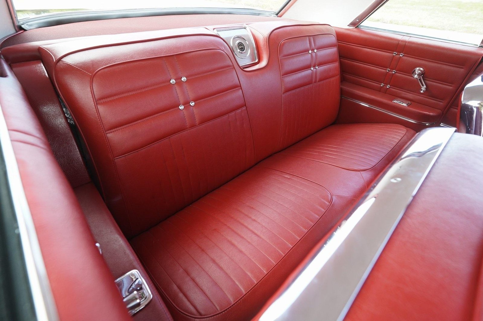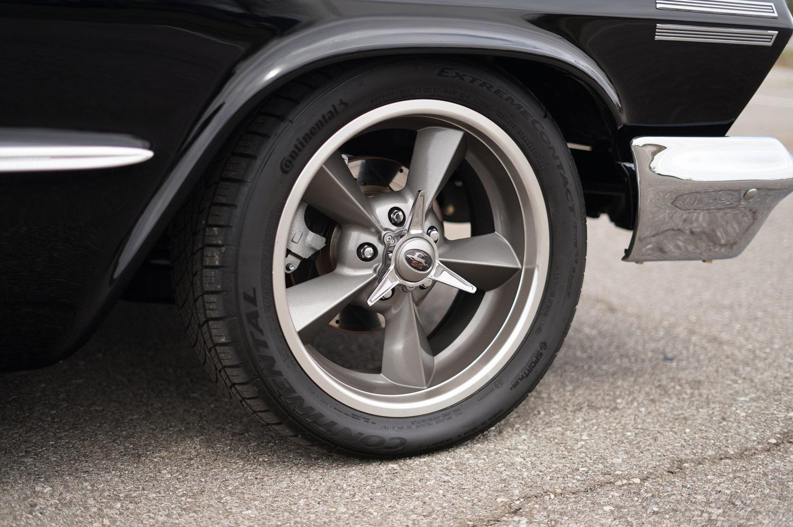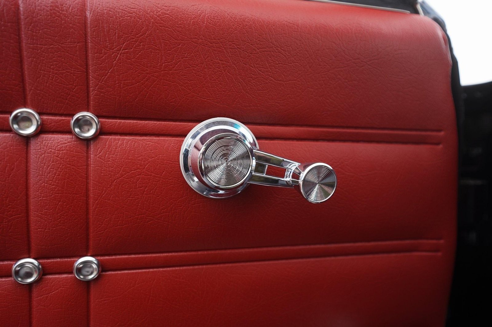 The red upholstery, bucket seats up front, and bench seating in the rear provide a comfortable and stylish ride. The particular black and red tuxedo carpeting, leather-wrapped steering wheel, new OER automatic shift console batt gauges, custom-made tachometer SS dash trim and knobs, center console, and aftermarket radio complete the impressive interior.