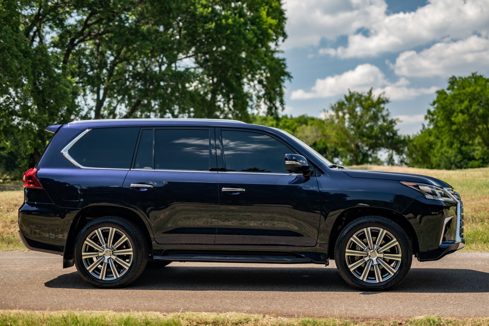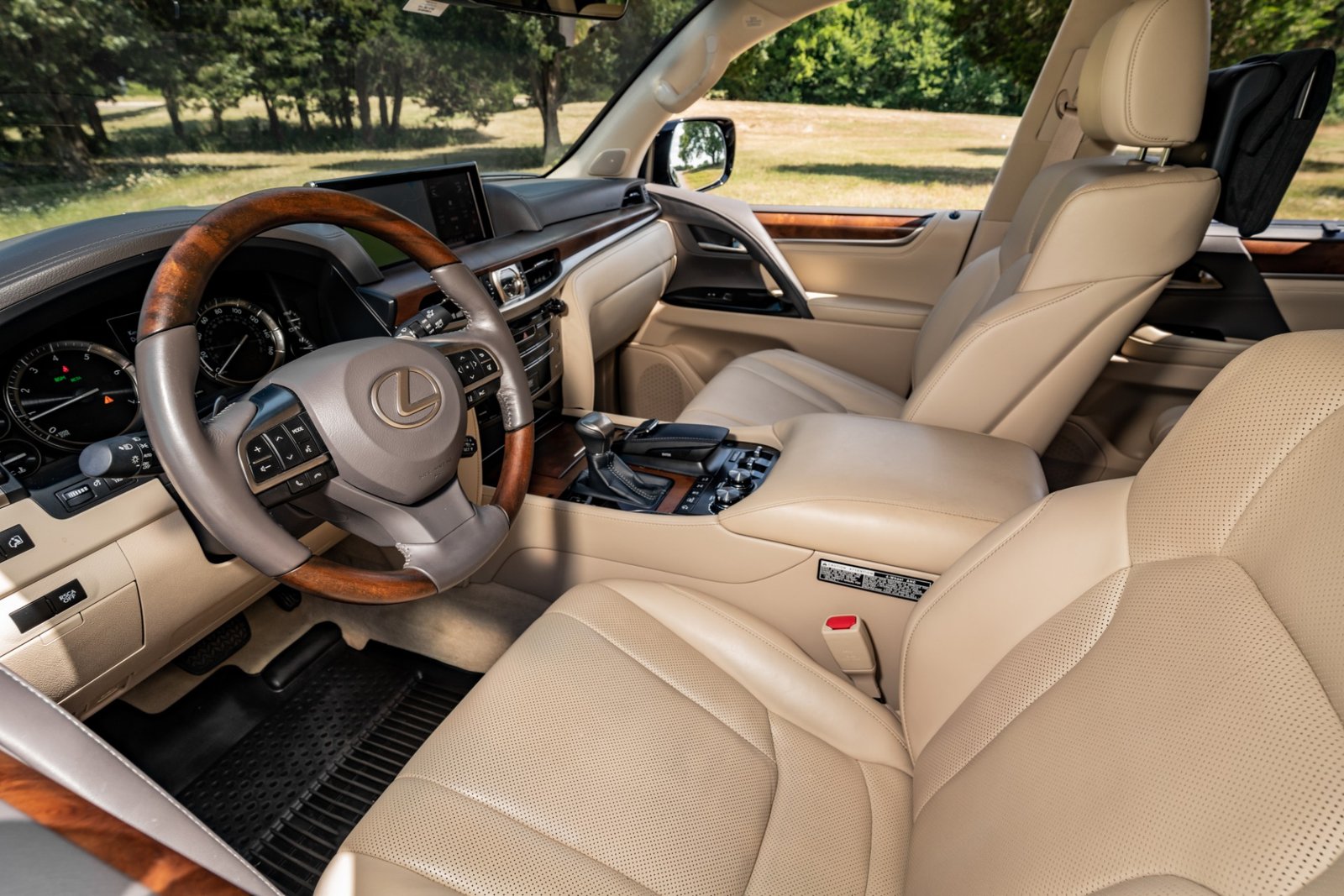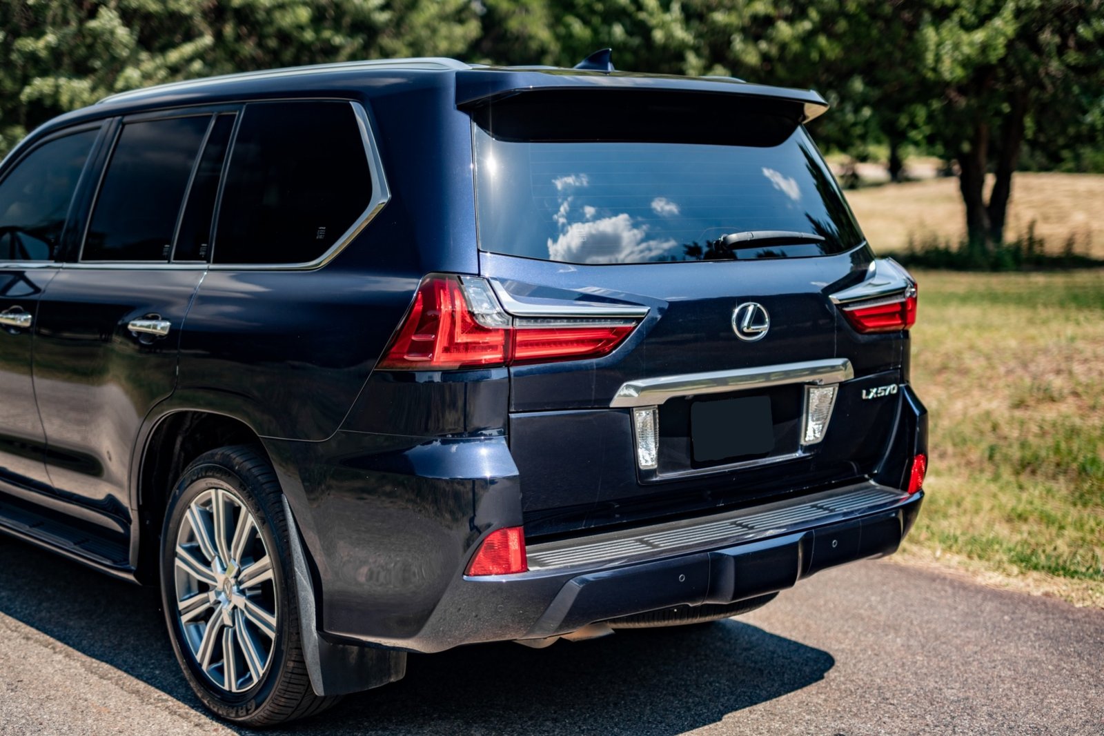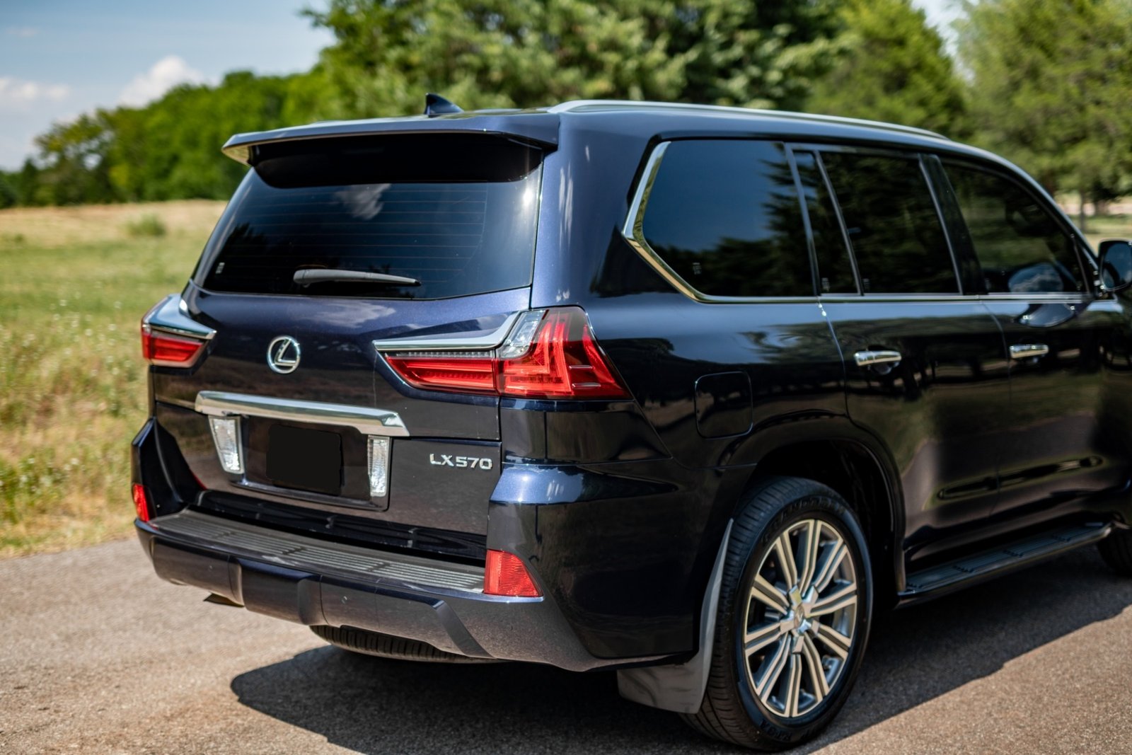 Clean CARFAX. Blue 2017 Lexus LX 570 4WD 8-Speed Automatic with Sequential Shift 5.7L V8 DOHC Dual VVT-i 32V – ADJUSTABLE SUSPENSION – AIR CONDITIONING – AUTO DIMMING MIRRORS – AUX PORT – BLIND SPOT DETECTION – BLUETOOTH – COLLISION WARNING SENSORS – CRUISE CONTROL – DUAL ZONE CLIMATE CONTROL – FOG LIGHTS – FRONT PARKING SENSORS – TURN SENSITIVE HEADLIGHTS – HEADS UP DISPLAY – HEATED AND COOLED SEATS – HEATED SEATS – HEATER – LANE KEEP ASSIST – LANE DEPARTURE WARNING – LEATHER SEATS – LED HEADLIGHTS – MEMORY PASSENGER SEAT – MEMORY SEATS – NAVIGATION – ONE TOUCH DRIVER WINDOW – ONE TOUCH PASSENGER WINDOW – POWER FOLDING MIRRORS – POWER LOCKS – POWER MIRRORS – POWER SEATS – POWER STEERING – POWER TELESCOPING AND TILTING STEERING WHEEL – POWER WINDOWS – PUSH BUTTON START – RAIN SENSING WIPERS – DIMMING REAR VIEW MIRROR – REVERSE CAMERA – REVERSE SENSORS – RUNNING BOARDS – SPORT MODE – SUNROOF – TALGATE STEP – TRACTION CONTROL – TRIP COMPUTER – TWILIGHT SENSING HEADLIGHTS – UNIVERSAL GARAGE DOOR OPENER – USB CHARGING PORTS – POWER DISC BRAKES All-Weather Floor Mats w/Cargo Tray Black Shimamoku Wood & Leather Steering Wheel Climate Comfort Seats Cool Box DVD Rear Seat Entertainment System Heads-Up Display Key Gloves Lexus Enform App Suite Lexus Enform Destinations Lexus Navigation System Radio: Mark Levinson Audio System.